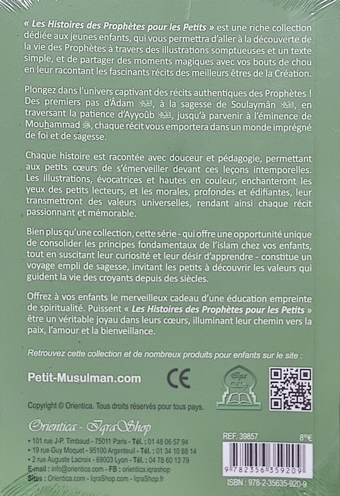 Bien plus qu’une collection, cette série - qui offre une opportunité unique de consolider les principes fondamentaux de l’islam chez vos enfants, tout en suscitant leur curiosité et leur désir d’apprendre - constitue un voyage empli de sagesse, invitant les petits à découvrir les valeurs qui guident la vie des croyants depuis des siècles. Offrez à vos enfants le merveilleux cadeau d’une éducation empreinte de spiritualité. Puissent « Les Histoires des Prophètes pour les Petits » être un véritable joyau dans leurs cœurs, illuminant leur chemin vers la paix, l’amour et la bienveillance.